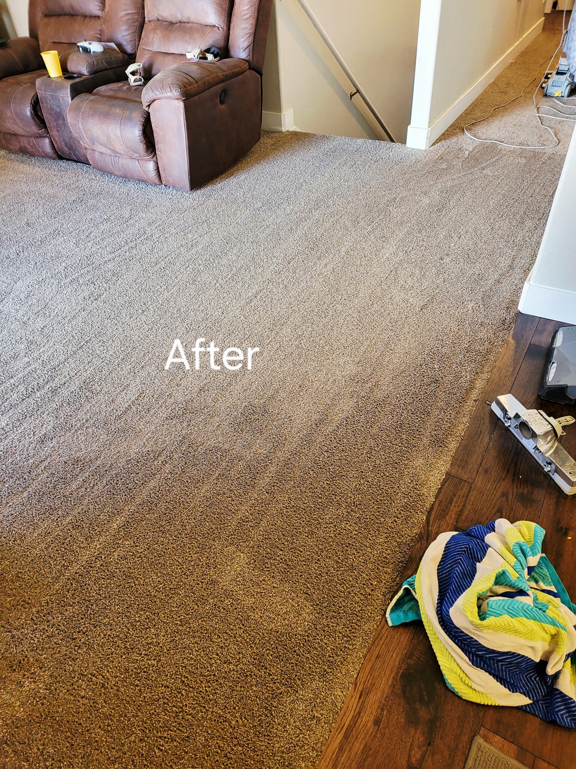 In the after photo, the same rug sits on a clean, refreshed carpet. The colors look brighter, the room feels lighter, and the transformation is obvious. Our 97% air / 3% moisture dry‑foam lifts dirt to the surface, crystallizes, and leaves your rug clean without soaking through to the backing.